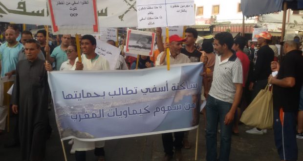 خرج سكان أسفي في مسيرة منددة بالوضعية البيئية المزرية التي آلت إليها الأوضاع في الآونة الأخيرة، وذلك بسبب تمادي كيماويات المغرب التابع للمجمع الشريف للفوسفاط، في إصدار الغازات السامة.